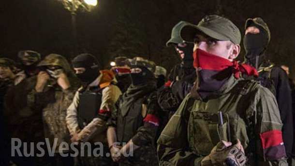 По дороге бойцы выкрикивали кроме традиционных лозунгов «Слава Україні — героям слава», «Слава нації — смерть ворогам», «Порошенко — х...ло» и «Яценюк — х...ло».