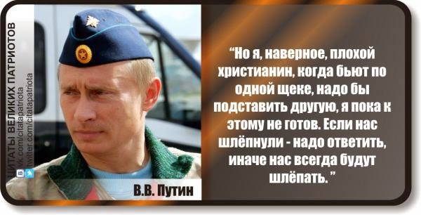 «Я, наверно, плохой христианин. Когда бьют по одной щеке, надо подставить другую. Но я пока к этому морально не готов. Если нас шлепнули, надо ответить, а то нас так и будут шлепать», признался Путин в 2012 году.