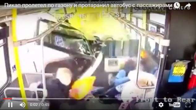 В США пассажиры стоящего на остановке автобуса стали участниками шокирующей аварии. На кадрах, снятых камерами, видно, как пикап на большой скорости вылетает с проезжей части на газон и таранит автобус.