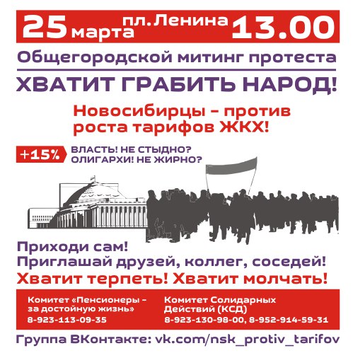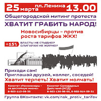 Напомним, что на предыдущем митинге в резолюции губернатору НСО заявлено предупреждение: если он не предпримет реальных шагов по отмене постановления № 254 в части 15%-го роста тарифов, горожане выразят свое недоверие ему, как губернатору! Больше предупреждений не будет! Поэтому в следующую субботу состоится особенный митинг!
