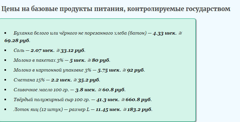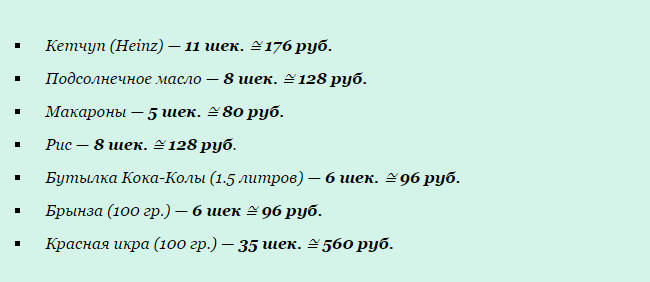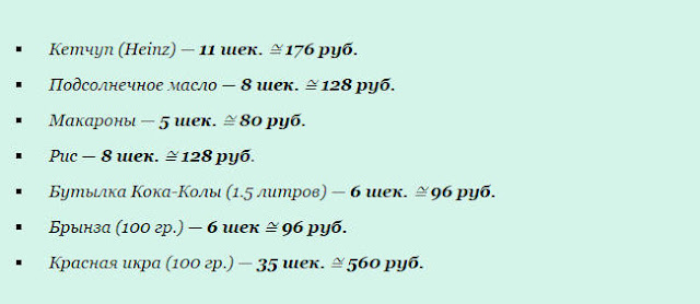 И то, на мой взгляд как человека побывавшего там, цены слегка завышены. В то же время, в РФ минимальная зарплата - 7 800 рублей, и икра красная стоит меньше - 360 рублей банка, но россиянин может на минимальную зарплату купить 21 банку икры, а вот израильтянин может купить, тоже на минимальную зарплату - 142 банки!