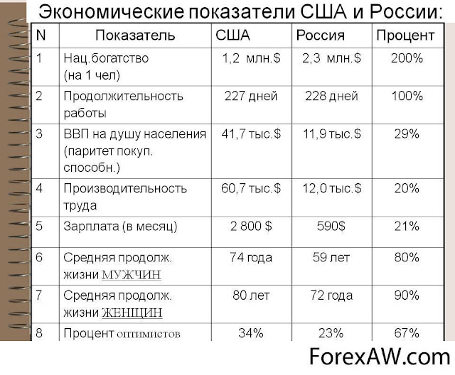 Работаем по времени примерно одинаково, но ВВП у нас меньше американского в ЧЕТЫРЕ раза! Производительность труда, у нас, таких блин - работящих и трудолюбивых меньше чем у ленивых американцев в ШЕСТЬ раз!!!