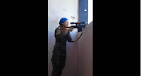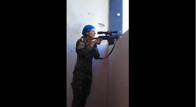 На кадрах отчетливо видео, как пуля террориста пролетает буквально в нескольких сантиметрах от головы девушки из Отрядов народной самообороны YPG сразу после ее выстрела из Снайперской Винтовки Драгунова. От огня бандита на стене за ее головой поднимается «фонтанчик» бетонной пыли.