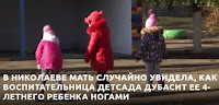"Открыла дверь и увидела: она хватает ребенка за спину, за платье, бросает ее, та падает, после чего были несколько ударов ногой в область спины. Ребенок закричал, я закричала, воспитательница повернулась в шоковом состоянии, сказала: простите, это впервые, такого больше не повторится", - рассказала мать девочки.Женщина сразу пошла жаловаться к заведующей, однако та моментально стала на сторону воспитательницы, потому что у нее 40 лет безупречного стажа.