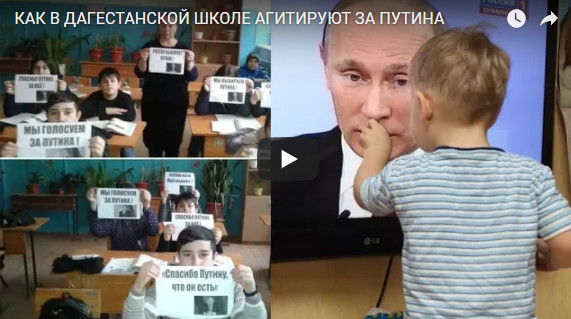 «Мы голосуем за Путина», «Спасибо Путину за всё», «Путин наш президент».При этом в последнем лозунге президент с заглавной буквы а его фамилия почему то со строчной. Почти на всех фото школьники сидят за партами. При этом некоторые девочки и мальчики поднимают плакаты так, чтобы их лиц не было видно.