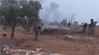 Видно, что продвигающиеся вперед джихадисты делают это крайне осторожно. Они падают на землю и ищут укрытия, не желая угодить под заградительный огонь российского офицера. Затем в отдалении виден взрыв.